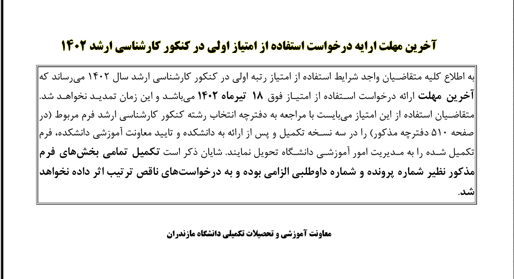 آخرین مهلت ارایه درخواست استفاده از امتیاز اولی در کنکور کارشناسی ارشد 1402 - دانشگاه مازندران