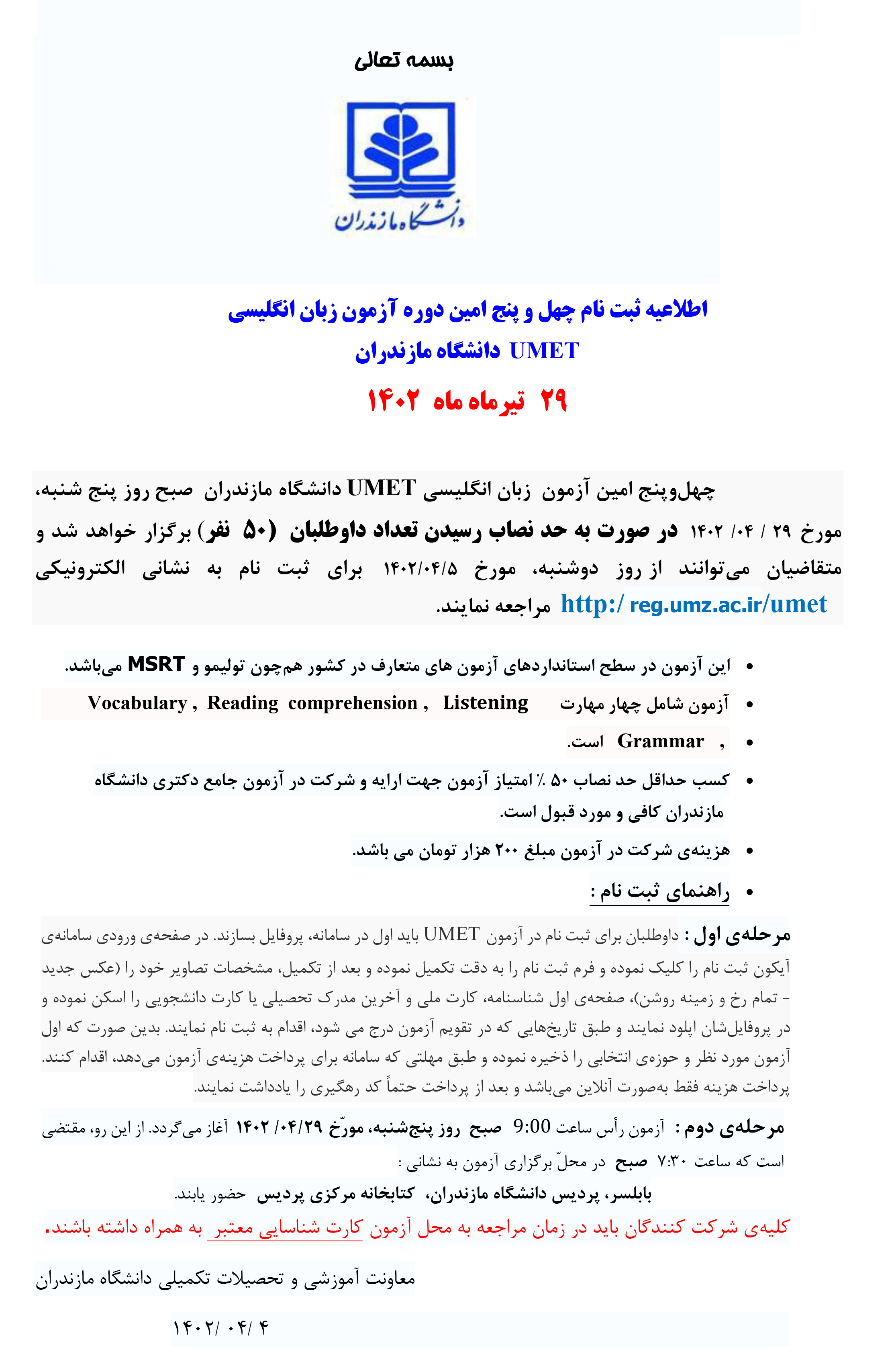 ثبتنام چهلوپنجمین دوره آزمون زبان انگلیسی UMET دانشگاه مازندران